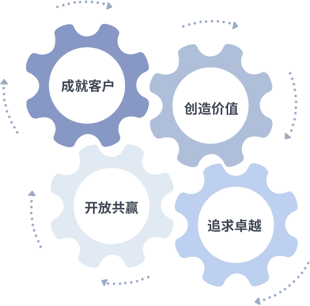 成就客户是一切决策的出发点,,,创造价值是衡量所有工作的标准,,追求卓越是我们做事做人的态度,,,,开放共赢是我们的格局也是最终的结果。。。。价值观的齿轮环环相扣,,,,推动着组织里的每个人不断向前。。